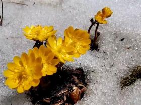 凍った地面から顔を出して咲くフクジュソウ黒竜江省牡丹江