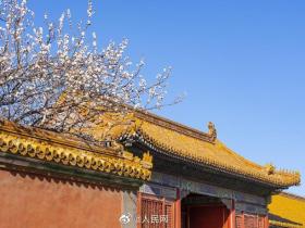 故宮の黄色い屋根瓦に映える白いアンズの花