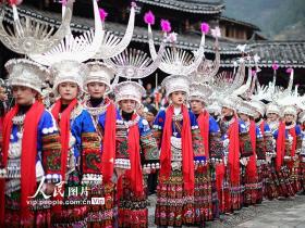 蘆笙舞を舞い「鼓蔵節」を祝う苗族の人々貴州省雷山