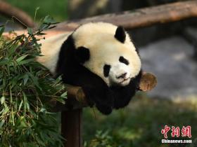 秋の陽だまりで日向ぼっこする重慶動物園のパンダ